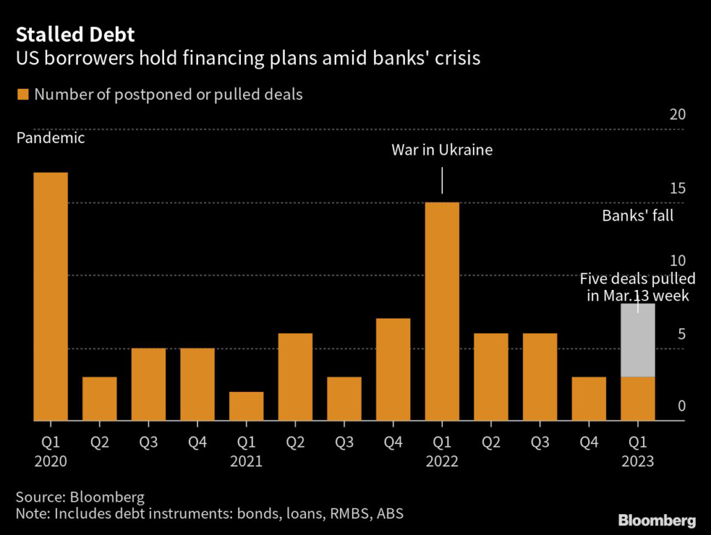 Much of that activity happened in the latest week, with at least five companies either postponing or pulling plans to sell structured bonds and leveraged loans, as markets digest regional bank failures and turmoil engulfing Credit Suisse Group AG.