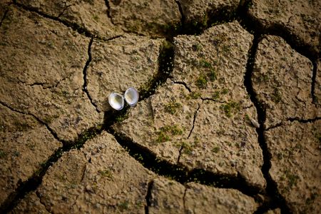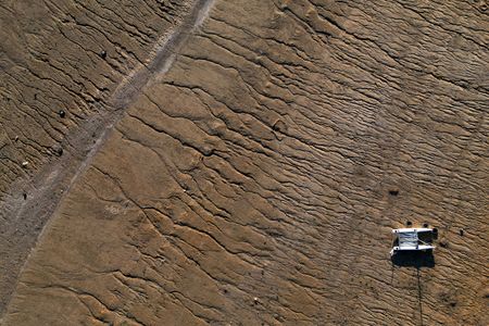 As he walks the lake’s dried-up bed, sailing instructor Claude Carriere checks on sailing boats stranded a few metres from the water.