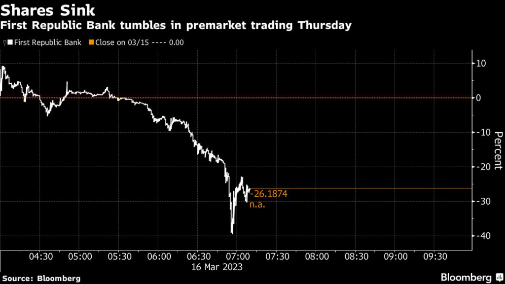 (Bloomberg) — First Republic Bank shares slid during after-market trading amid concern its crisis is far from over despite efforts of larger banks to restore confidence by agreeing to add $30 billion of deposits to the lender.