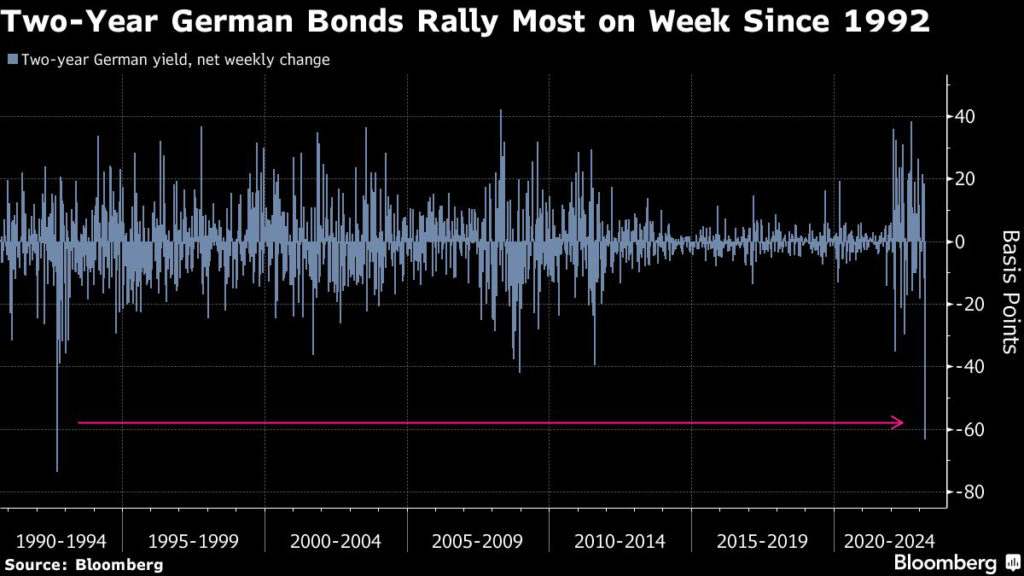 Gauges of implied rates volatility hit the highest levels since late 2022, while German two-year bonds traded in the widest peak-to-trough range on record Wednesday, according to data compiled by Bloomberg going back to September 1990.