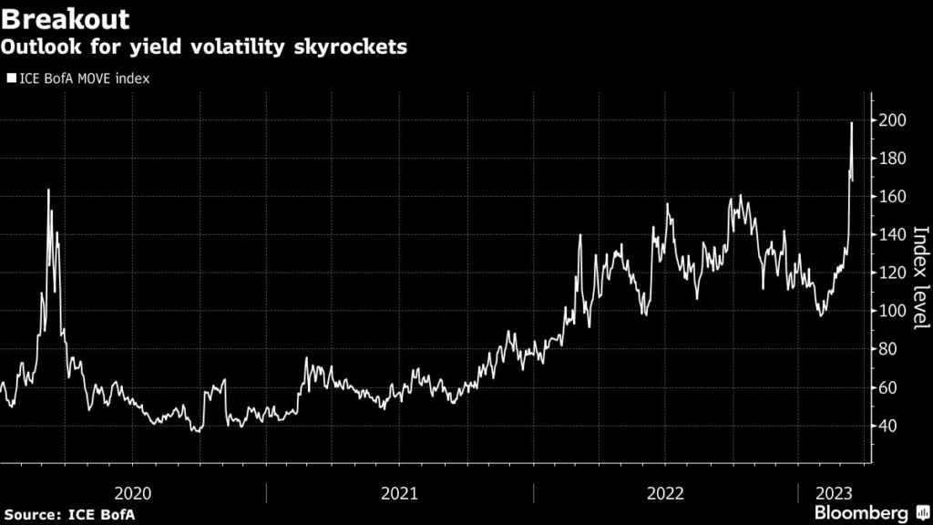 Amid all the angst, the widely watched MOVE index, an options-based measure of expected volatility in Treasuries, hit 199 points on Wednesday, having roughly doubled since the end of January.