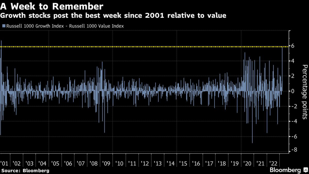 Investors have been snapping up classic tech growth companies like Microsoft Corp., Alphabet Inc. and Apple Inc. that are known for their stability and strong cash flows. The Russell 1000 Growth Index jumped 4.1% this week while its value counterpart sank 1.7%, the biggest gap between the two since 2001.