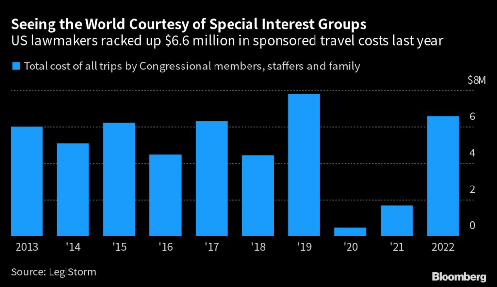 (Bloomberg) — Members of Congress and their staffers rebounded from pandemic travel anxiety in 2022, accepting more than $6.6 million worth of airline tickets, hotel rooms and meals paid for by special interest groups.