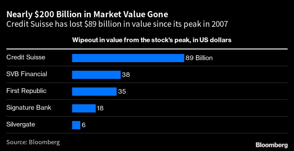 (Bloomberg) — From as much as $96 billion to around $3 billion: Credit Suisse Group AG is poised to join the historic ranks of finance giants sold at fire-sale prices in the grip of a market crisis.