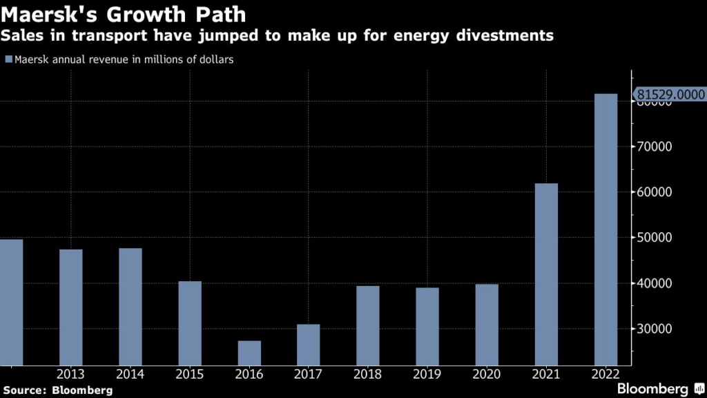 TotalEnergies SE bought Maersk Oil for about $7.45 billion in shares and debt payments in 2018 while Maersk Drilling was spun off in a stock-exchange listing for about $3.6 billion in 2019.