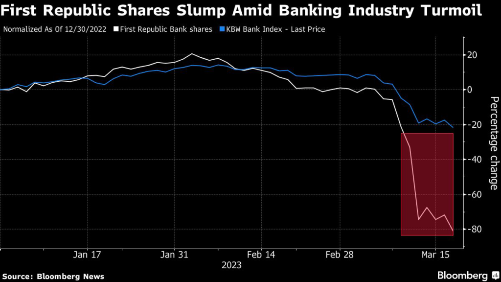 jumped 4.8%. First Citizens BancShares Inc. jumped by the most since November 2020 after a report that it is still hoping to make a deal for all of Silicon Valley Bank. Wall Street’s larger firms mostly rallied with JPMorgan Chase & Co., Morgan Stanley and Goldman Sachs Group Inc.
