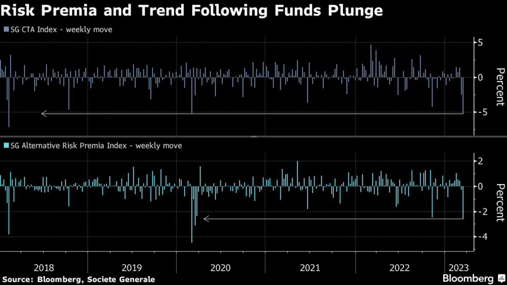 Trouble at Credit Suisse Group AG — on the heels of regional banking disorder in the US — is hitting popular rules-based trades as investors bet the crisis foreshadows an end to Federal Reserve policy tightening.