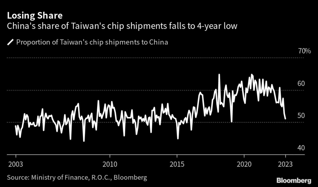 China’s market share of Taiwanese IC exports plunged to the lowest level since February 2019, based on Bloomberg calculations of official data.