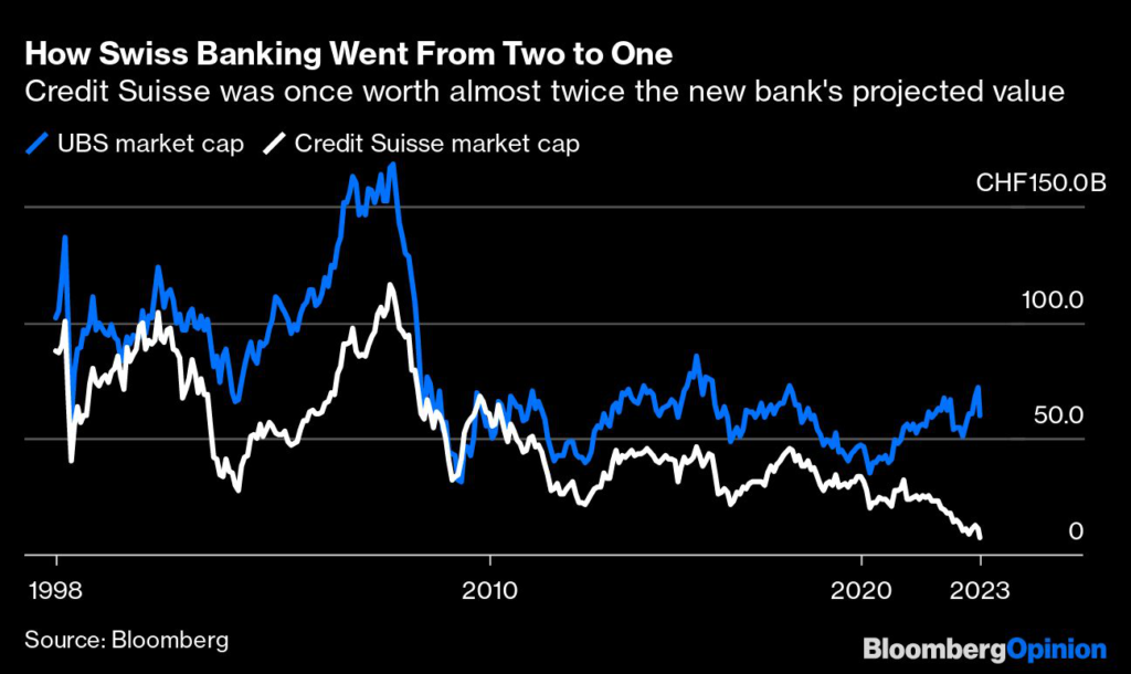 Credit Suisse Group AG fell Sunday when Swiss officials brokered a deal with UBS Group AG for a 3 billion-franc ($3.2 billion) acquisition aimed at avoiding a broader financial crisis.