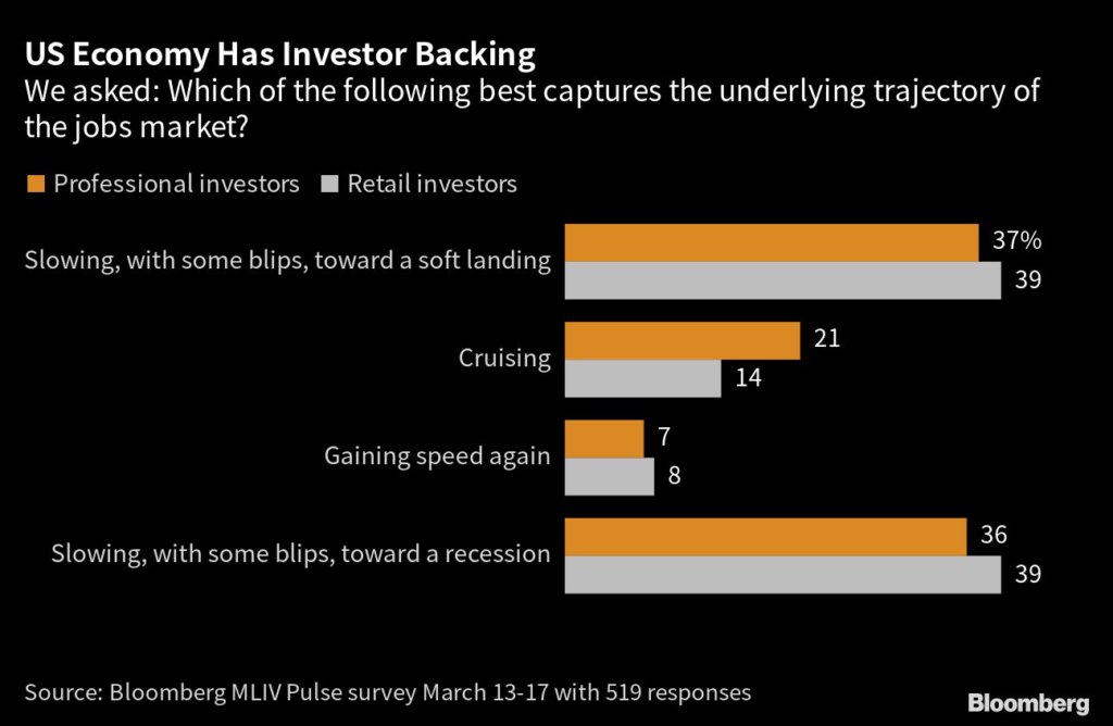 The survey findings suggest a mismatch between what investors see as the likely economic outcomes, and the direction that trades have taken — driven by market momentum and concern that banking troubles could snowball.