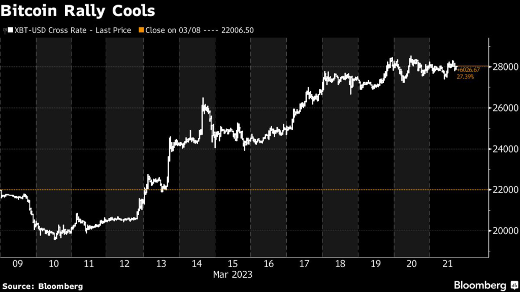Bitcoin has surged almost 40% since March 10, as turmoil in the global banking system prompted some investors to turn to what has long been promoted as an alternative. All eyes in the digital asset market are on a decision by the Federal Reserve on interest rates on Wednesday.