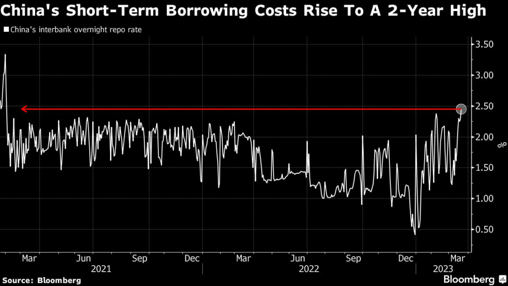 (Bloomberg) — Signs of a cash squeeze are appearing in China as the quarter-end approaches, underscoring how the nation’s economic rebound is driving demand for loans and prompting the central bank to ease policy.