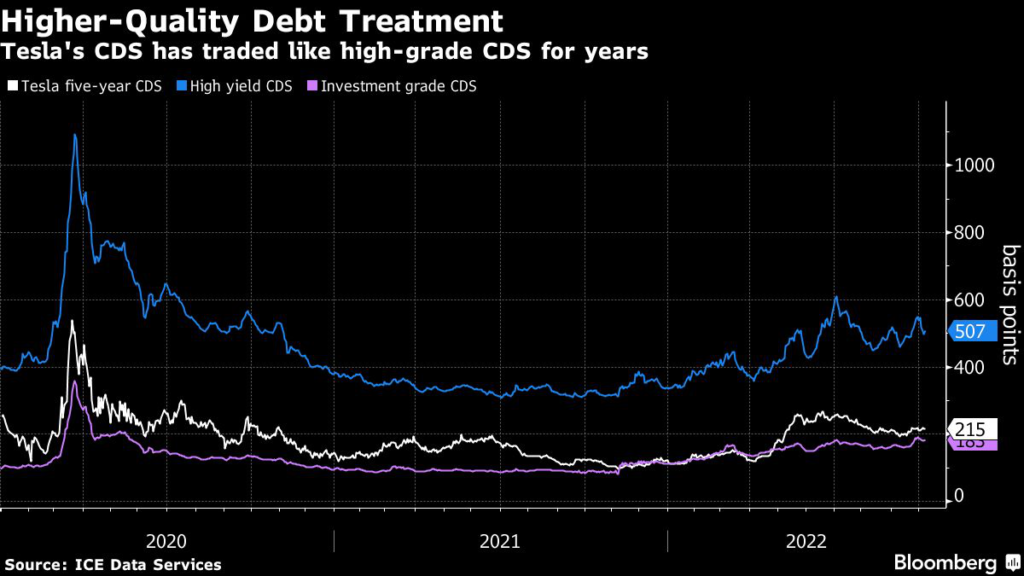 It secured a $5 billion revolving credit facility earlier this year, a sign that it was nearing investment-grade status. The electric vehicle firm has little outstanding debt, and its five-year credit-default swaps are already trading in line with high-grade borrowers, according to data compiled by Bloomberg.