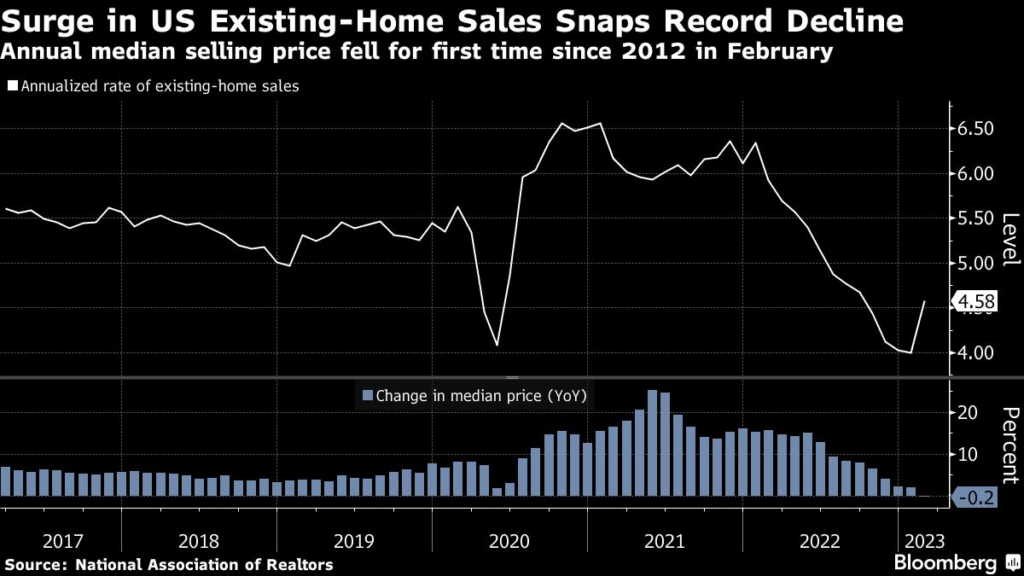 (Bloomberg) — US sales of previously owned homes rose in February by the most since mid-2020, snapping a record year-long slide tied to rising interest rates and affordability constraints.