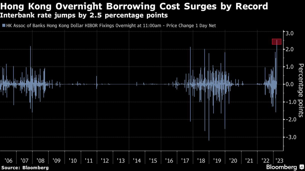 The aggregate balance — the gauge of interbank liquidity, has shrunk by more than 80% since its peak in 2021 to HK$77 billion, the lowest level in almost three years. That means the wild swings may continue.