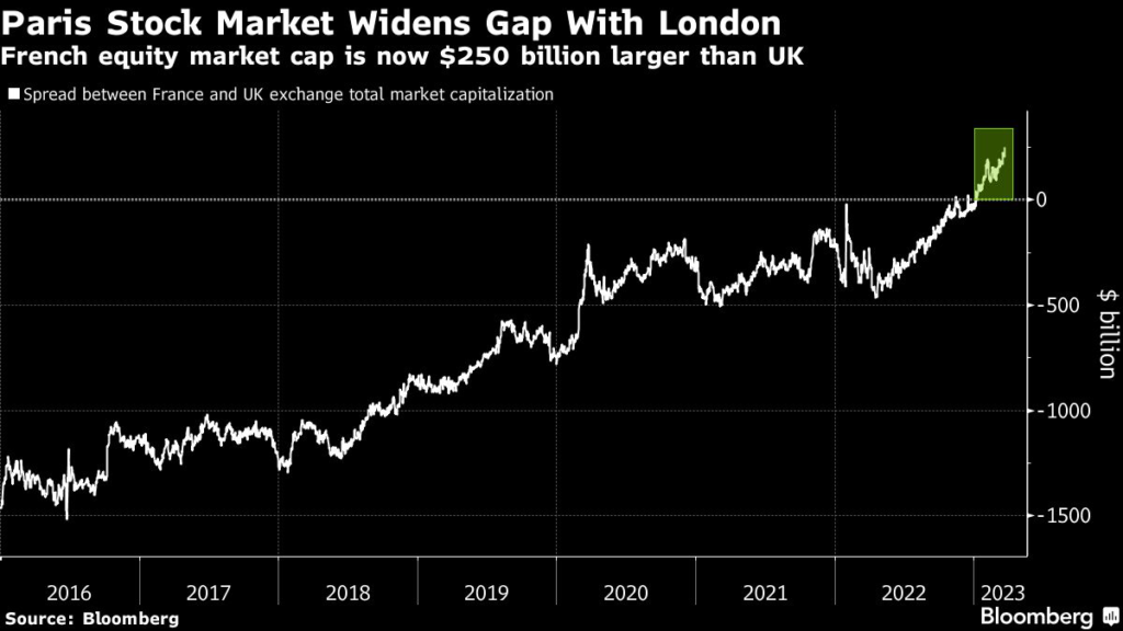 With a total market capitalization of $3.13 trillion, Paris now exceeds that of the UK’s capital by $250 billion, according to data compiled by Bloomberg.