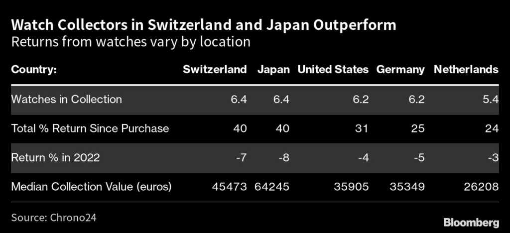 (Bloomberg) — Financial returns earned by luxury watch owners based in Switzerland and Japan are the highest compared to collectors in other parts of the world, according to data from trading platform Chrono24.