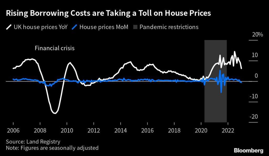 (Bloomberg) — UK house prices fell at the fastest pace in 12 years in January, barring the pandemic, as higher mortgage costs piled further pressure on the housing market, official figures showed.