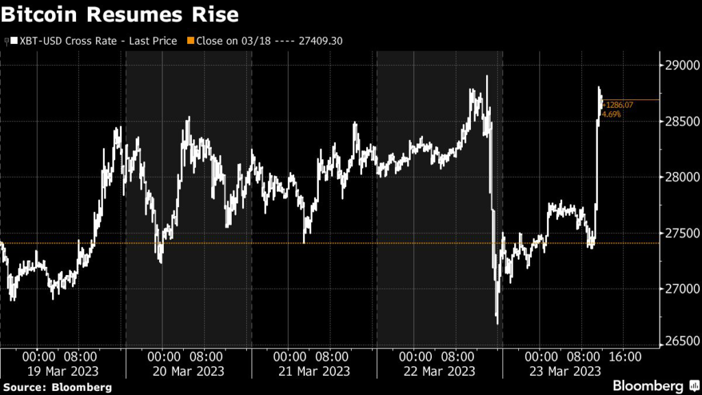 (Bloomberg) — Bitcoin resumed its push back toward $30,000 and smaller digital tokens rallied as a broad renewal in risk appetite prompted investors to downplay a widening regulatory crackdown.