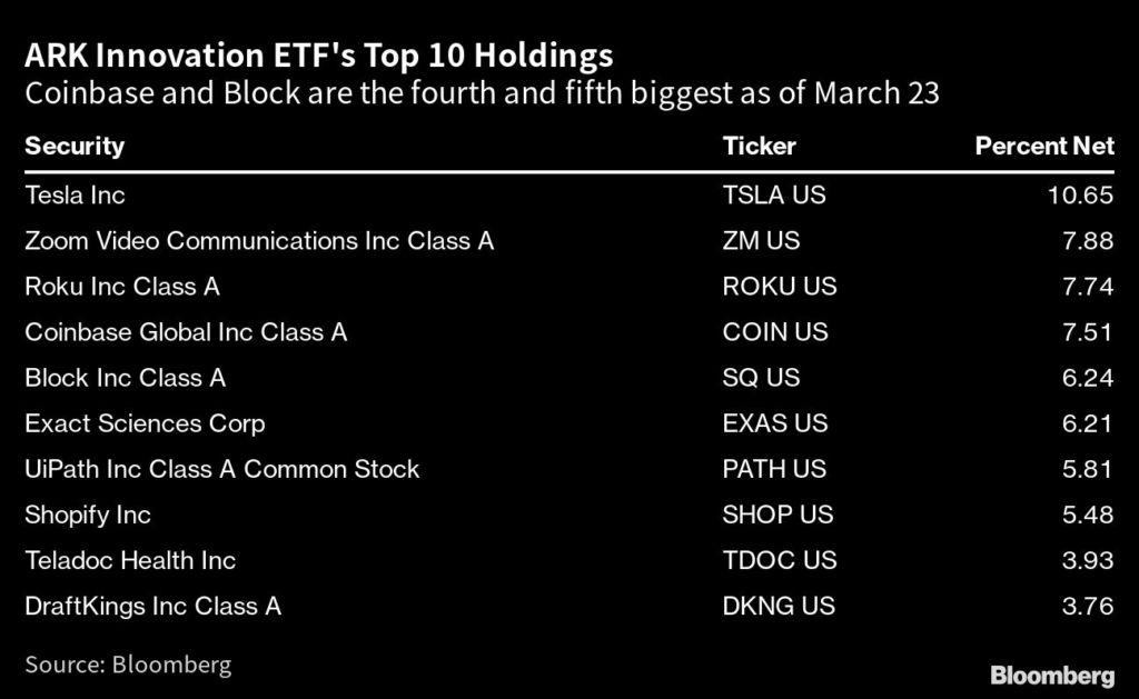 Coinbase currently makes up 7.5% of ARKK’s holdings, while Block represents 6.2%, according to data compiled by Bloomberg.