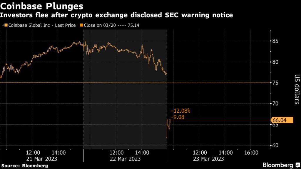Shares of Coinbase plunged 14% in New York, after it disclosed late Wednesday that it had received a so-called Wells notice from the SEC.