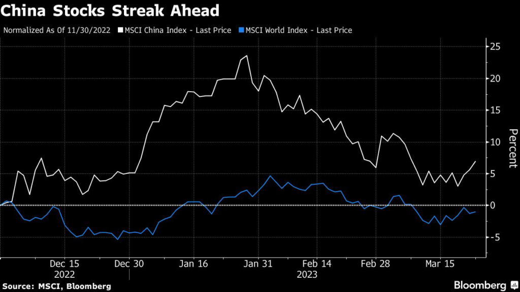 Chinese banks stocks are among the world’s top performers this month while markets in the US and Europe count the costs from three American bank failures and the rescue of Credit Suisse Group AG.
