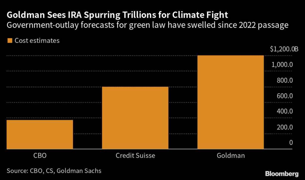 US President Joe Biden’s landmark clean-energy law will cost roughly $1.2 trillion — three times more than the official government forecast — and spur trillions more in private-sector investments, according to Goldman Sachs Group Inc.