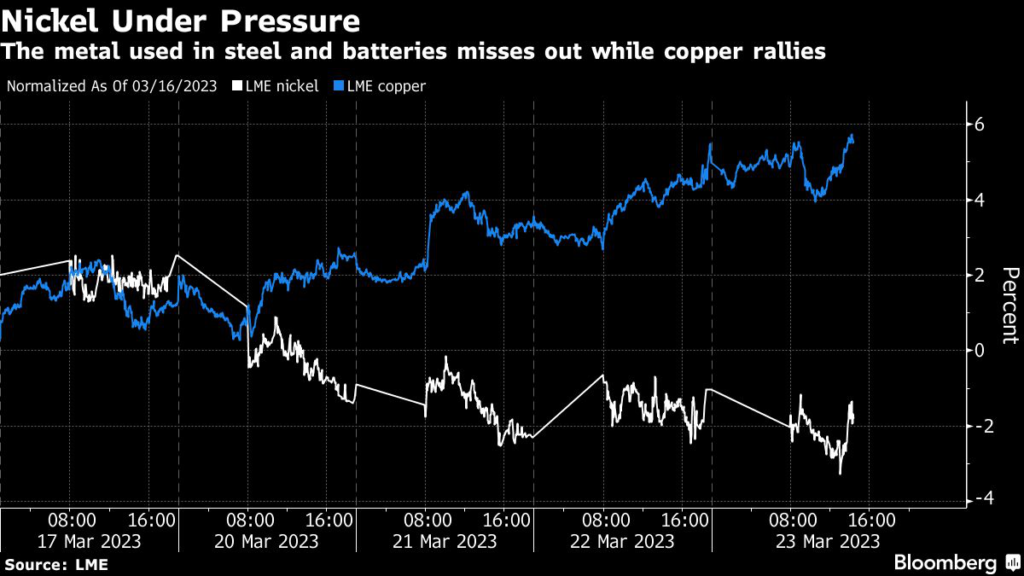 LME nickel prices fell sharply as trading began on Monday, and have remained under pressure this week even as other metals climbed amid efforts by authorities to stem the recent banking crisis.