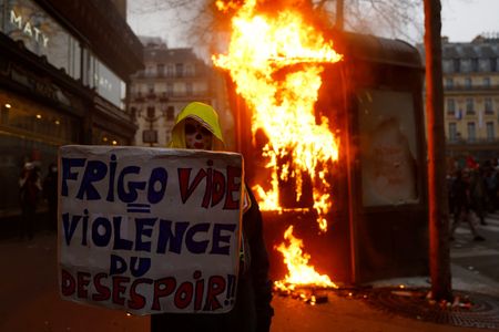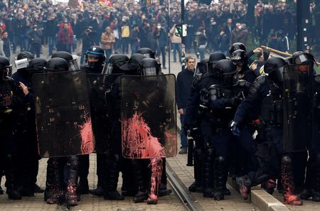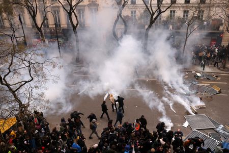 PARIS (Reuters) -Police fired tear gas to repel violent black-clad anarchists in Paris on Thursday as hundreds of thousands of mainly peaceful protesters marched across France against President Emmanuel Macron’s plan to raise the pension age.