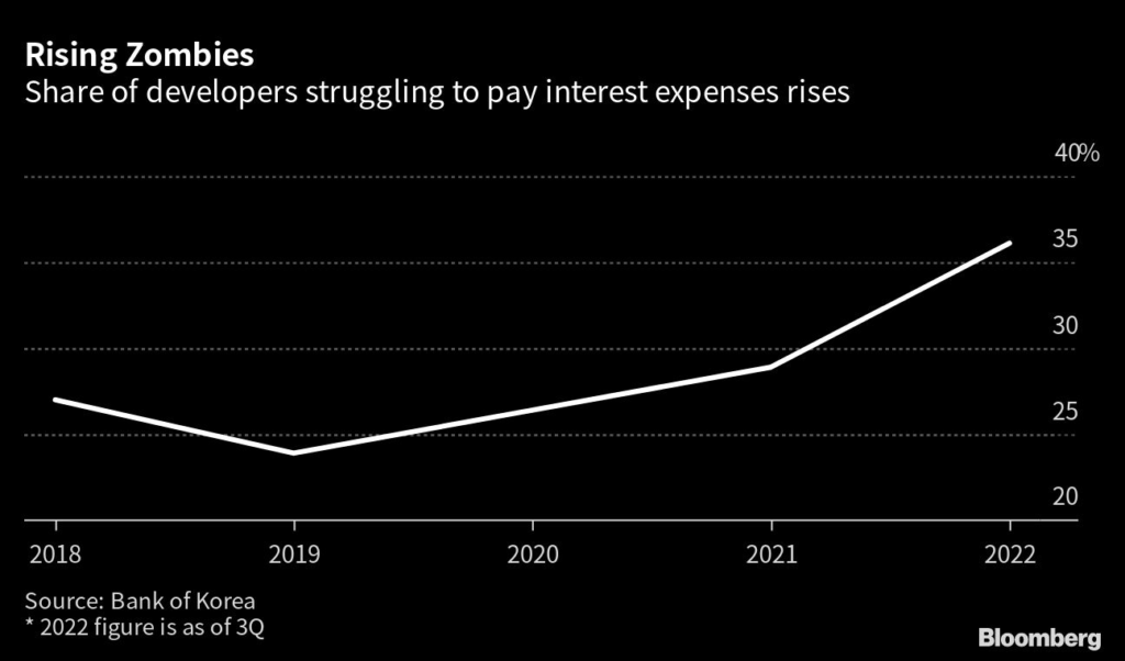 (Bloomberg) — The share of South Korean developers struggling to pay interest expenses on their loans rose by a quarter last year as the central bank aggressively tightened policy and the local housing market began to wobble.