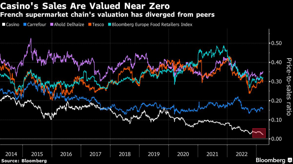 Casino’s equity is valued at less than €620 million, or 0.02 of sales, the lowest among European retailers.