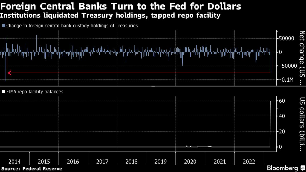 (Bloomberg) — Foreign central banks liquidated Treasury holdings at the fastest clip in nine years and tapped a key Federal Reserve facility to raise cash as banking stress roils markets.