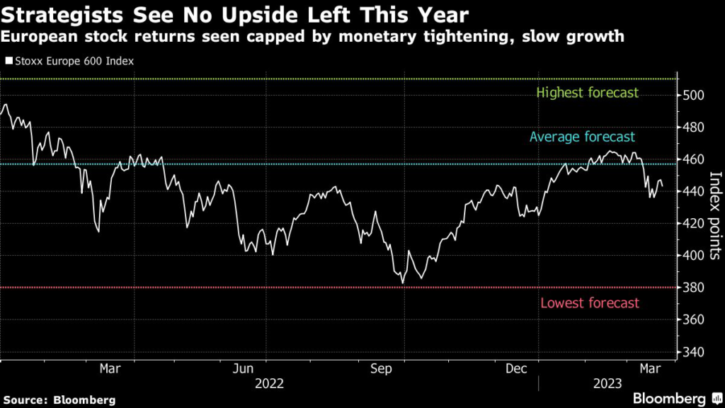 After a 4% year-to-date gain, the Stoxx Europe 600 index will rise to 457 points by end-2023, according to the average of 17 forecasts in a Bloomberg survey, implying a gain of only about 2% from Wednesday’s close.