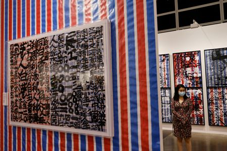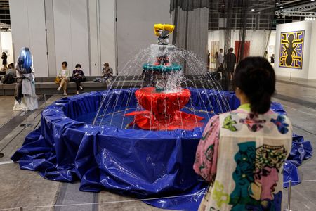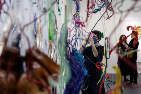 HONG KONG (Reuters) – Thousands of people thronged on Thursday into Art Basel Hong Kong, one of Asia’s largest contemporary art fairs, to view large-scale installations from hanging money trees to a pumpkin 8 feet (2.4 m) tall.