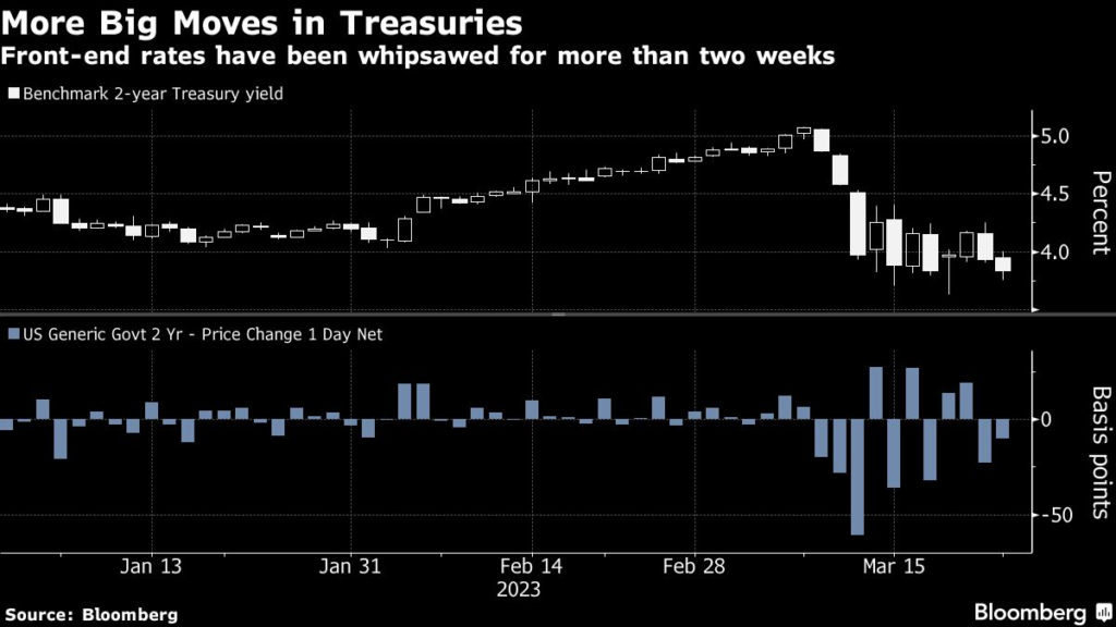 The two-year Treasury yield fell as much as 18 basis points on Thursday to 3.75%, having earlier been up close to 7 basis points, marking an 11th straight session with an intraday range of more than 20 basis points.