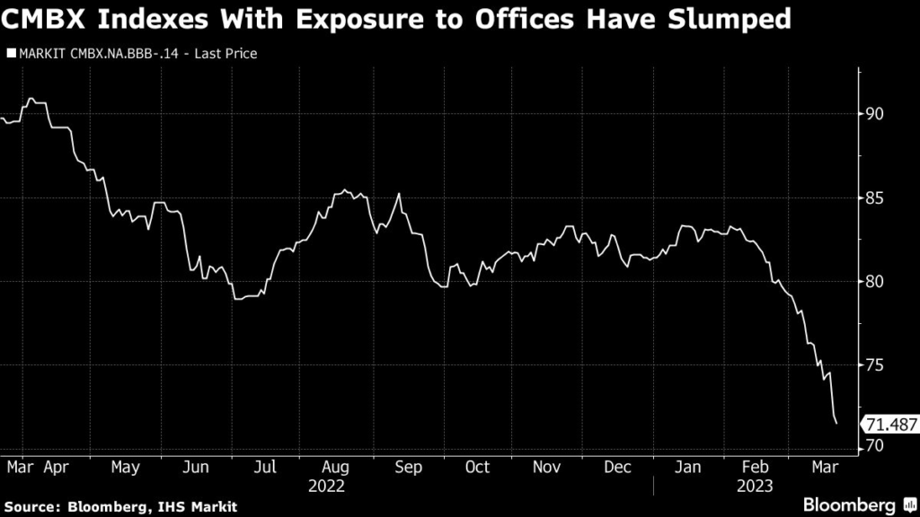 (Bloomberg) — Money managers have stepped up their bearish bets against office landlords, wagering that the US regional banking crisis will slash the availability of credit to property owners that were already suffering from the pandemic and rising interest rates.