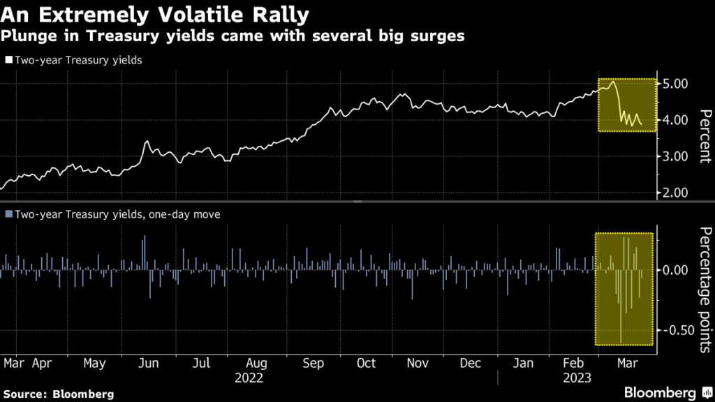 There’s another problem: no risk-on signal is flashing in government bonds, where plunging rates are nothing if not bets that the economy faces a reckoning traceable to bank anxiety.