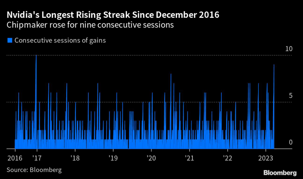 logged its longest winning streak since December 2016 on Thursday. The chipmaker is the best-performing stock on the S&P 500 Index this year, thanks to an 84% rally that’s been fueled by the recent artificial-intelligence frenzy.