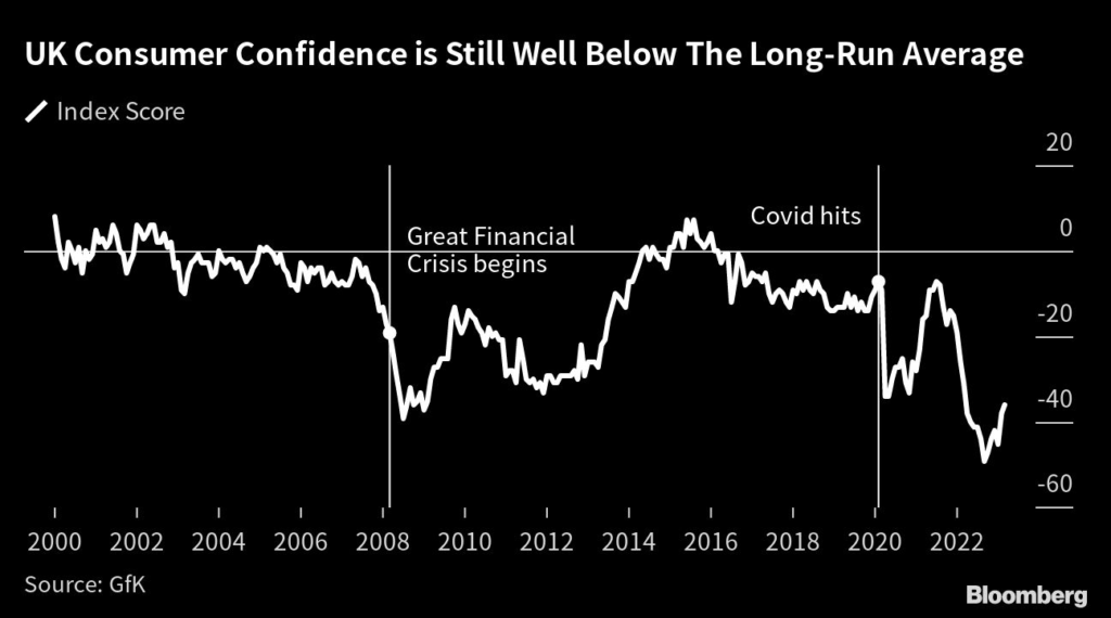 (Bloomberg) — UK shoppers are expecting their personal finances to deteriorate further over the next year, in a sign that sticky inflation and continuing interest-rate hikes are weighing on sentiment.