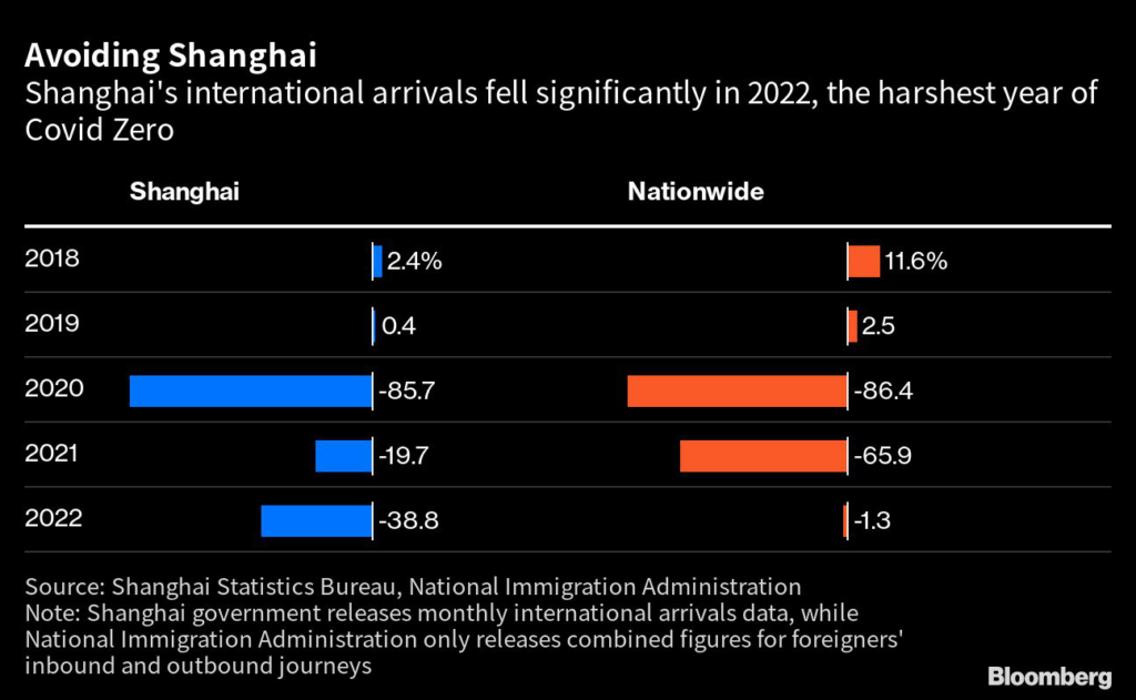 (Bloomberg) — A year after the lockdown that made Shanghai a byword for all that was wrong with the country’s Covid approach, China’s most international city is showing the effects of a policy that left the nation disconnected from the world.