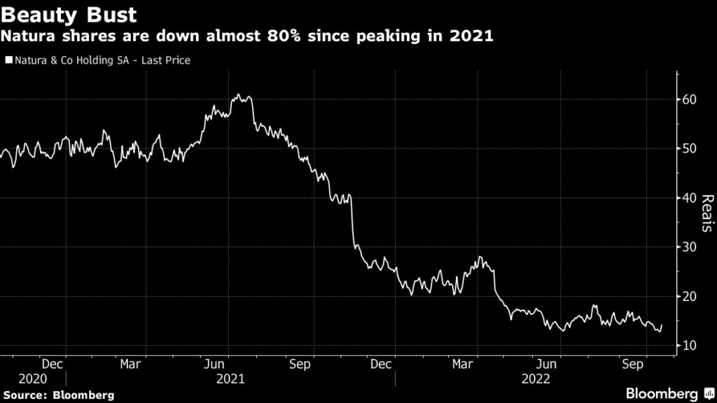 Shares of Natura were up 1% in Sao Paulo on Monday at 12:30 p.m. local time. They’re still down 77% since peaking in 2021, for a market value of around 19 billion reais.