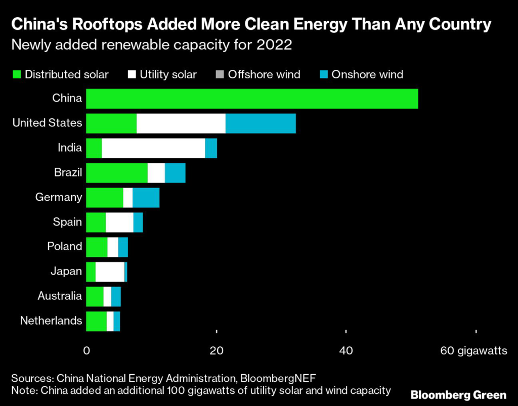 The resulting renewables boom saw China build more small-scale solar last year than the total new clean power capacity in any other country. Roughly one of every five panels installed worldwide in 2022 was fixed atop a Chinese home or business.