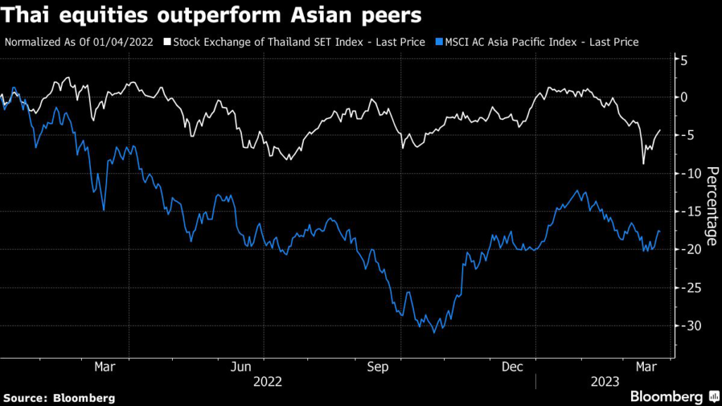Thailand’s stocks have climbed more than 4% from a March low, outperforming the regional gauge in the period and narrowing its year-to-date losses.