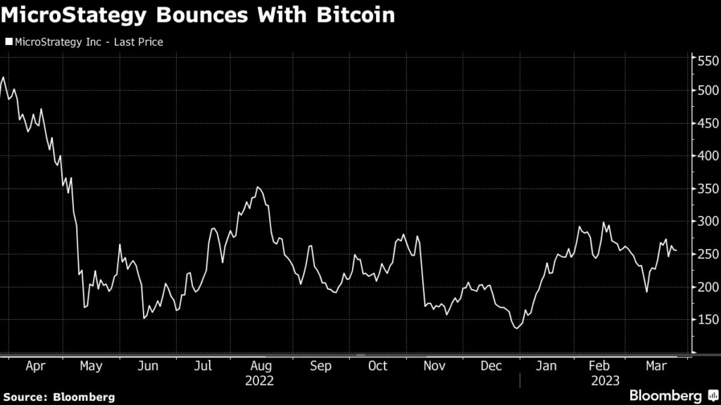 Shares of MicroStrategy rose less than 1% to $258.98 in New York. The stock has jumped more than 80% this year, after falling 74% in 2022.