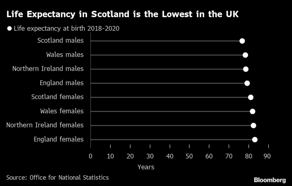 Life expectancy for men in Scotland is the lowest of any group in the UK’s four constituent nations, according to the Office for National Statistics. Like the rest of the UK, it also faces a post-Brexit labor shortage that’s hit everything from hospitality to childcare.