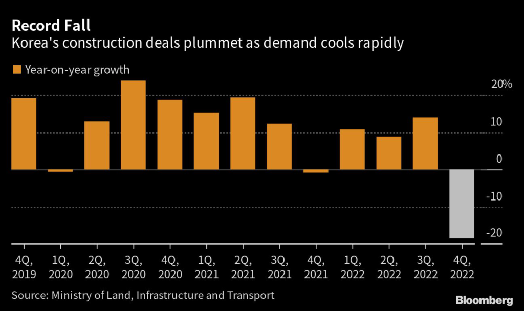 South Korea’s construction deals fell by a record margin last quarter as the property market cooled with rising interest rates weakening demand and inflation fueling costs.