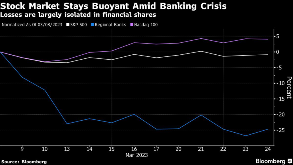 In a span of weeks, the dominant market theme has shifted from a “no landing” scenario where growth persists at the same time central banks push restrictive policy for longer, to everything from banking chaos to a recession to some type of Fed-fueled renaissance in technology shares.