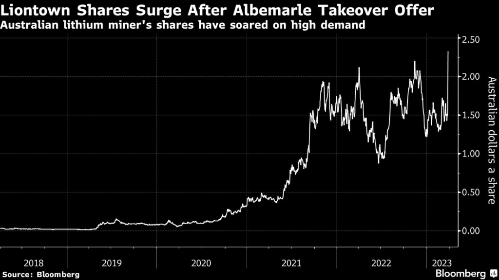 (Bloomberg) — Albemarle Corp., the world’s top lithium producer, has had its A$5.5 billion ($3.7 billion) cash offer for Liontown Resources Ltd rejected by the Australian developer, sending shares in the target up almost 70% and fueling expectations of wider consolidation.