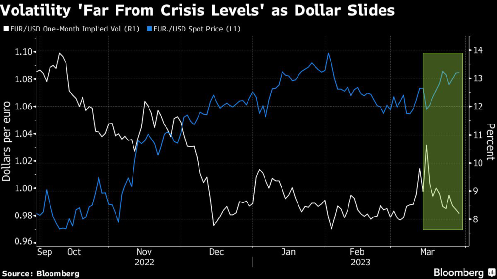Still, the move was “far from crisis levels,” strategists at BofA said. Volatility remained lower compared with late last year, when a surge in demand for the US currency drove euro-dollar one-month implied volatility to the highest levels since early 2020.