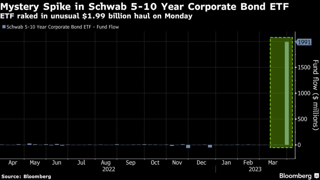 Assets in Schwab 5-10 Year Corporate Bond ETF (ticker SCHI) swelled to a record $2.33 billion on Monday from around $356 million previously.